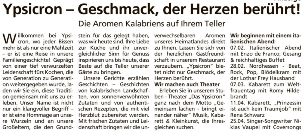 Herzliche EInladung zu 4 kulturellen Events in der neuen Trattoria Ypsicron in Felsberg! Beitragsnavigation Felsberger Weihnacht mit Jens & Nicki (Country Pur)Lothar Frey Hausband live in Trattoria Ypsicron