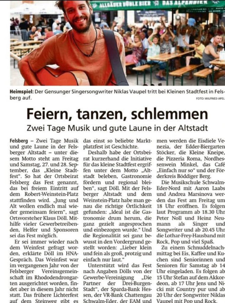 Ganz herzliche Einladung vom Ortsbeirat Felsberg zu unserem kleinen Stadtfest vom 27.-28.09.2024 mit viel Live Musik und leckeren Essen & Getränke aus lokaler Gastronomie.
